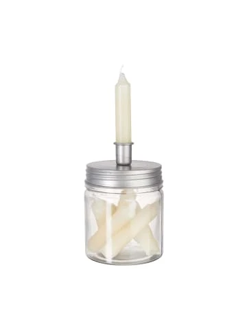 Raffiniert: Das Candle Jar Glas mit Kerzenhalter setzt dem Aufbewahrungsglas für Little Light Kerzen noch einen drauf: Auf dem Deckel aus silberfarbenem Metall kann eine der sieben cremefarbenen Little Light Kerzen befestigt werden. Sobald sie abgebrannt ist, ist Nachschub ohne langes Suchen griffbereit. Ganz schön praktisch dieses 2-teilige Set – und dekorativ sowieso.