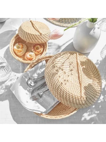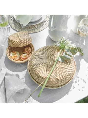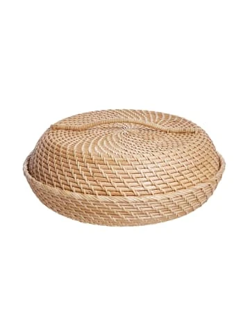 So ein hübscher Ordnungshüter: Bei der dekorativen Ronda Korbschale mit Deckel aus dem Naturmaterial Rattan verteilen sich Schlüssel, Haarspangen und andere Kleinigkeiten auf fast 33 cm Durchmesser. Das Gesuchte lässt sich also schnell herausfischen, und gleichzeitig verknoten oder verhaken sich die Dinge nicht so schnell. Optisch harmoniert die hübsche Korbschale übrigens mit natürlichen oder exotischen Looks und naturverbundenen Materialien wie z.B. Holz oder Leinen.