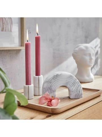 Weißer Marmor ist edel und so angesagt. Deshalb verlieben Sie sich auf den ersten Blick in den modernen Marble Stabkerzenhalter und machen ihn ganz schnell zum erklärten Lieblingsaccessoire auf dem gedeckten Tisch. Oder sie platzieren den Kerzenhalter mit edlem Goldakzent dekorativ auf einem Board oder Beistelltisch. In einer weiteren Größe erhältlich, zudem gibt es passende Marble Deko Objekte und Teelichthalter, ideal auch zum Kombinieren.