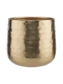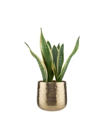 Leichte Unebenheiten auf der golden schimmernden Oberfläche machen den Planta Übertopf aus Eisen zu einem Schmuckstück auf der Fensterbank, dem Ess- oder Beistelltisch. Perfekte Dekopartner sind immergrüne Sukkulenten wie Sansevieria, Aloe Vera oder Pfennigbaum, und auch Kakteen harmonieren sehr schön.