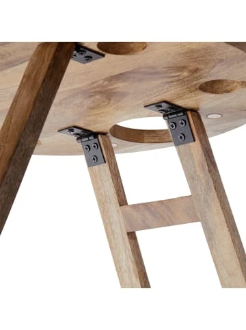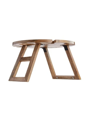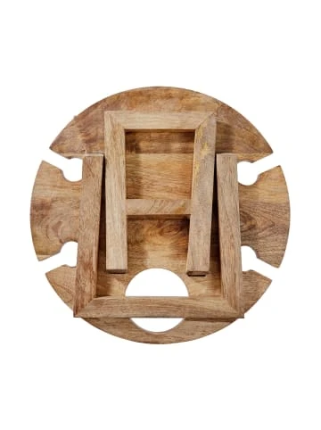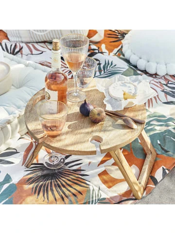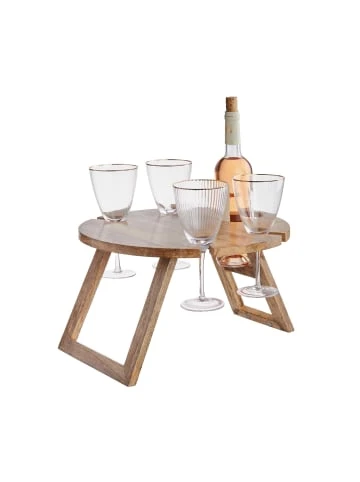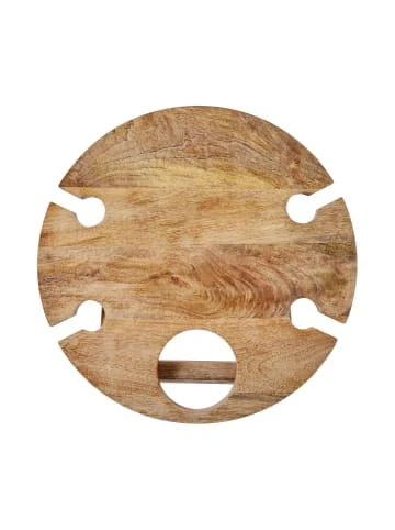 Geburtstage und andere Feste feiert man gerne im Park – und das stilvoll mit dem Chin Chin Picknicktisch mit Halterungen aus Mangoholz. 4 Stielgläser, etwa Wein- oder Sektgläser, und eine Flasche lassen sich in diesen Halterungen ziemlich sicher parken, und für kleine Snacks ist auf der Tischplatte auch noch Platz. Zum Transportieren falten Sie den kleinen, runden Tisch einfach zusammen, und so kann er platzsparend verstaut auf seinen nächsten Einsatz warten.