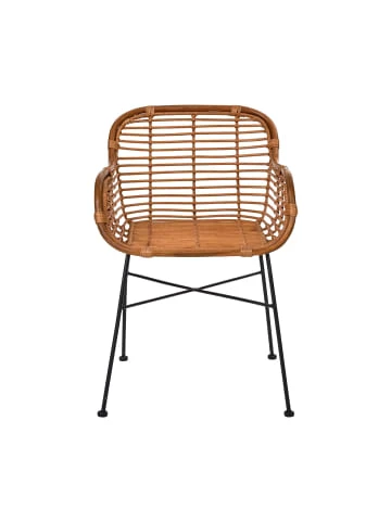 Mit unserem Rattan-Stuhl Hacienda setzen Sie in der Küche oder im Esszimmer auf moderne Lässigkeit und unkompliziertes Wohnen. Das Design mit honigfarbenem Rattan, praktischer Armlehne und schwarzem Eisen-Gestell wirkt optisch angenehm leicht und erhält mit einem Kissen oder Lammfell im Handumdrehen eine noch individuellere Note. Da Rattan ein Naturmaterial ist, kann es hierbei zu Unregelmäßigkeiten in der Farbgebung kommen, die den natürlichen Charakter des Sitzmöbels unterstreichen. Auch als Stuhl ohne Armlehnen erhältlich. – Einfarbig – Modern