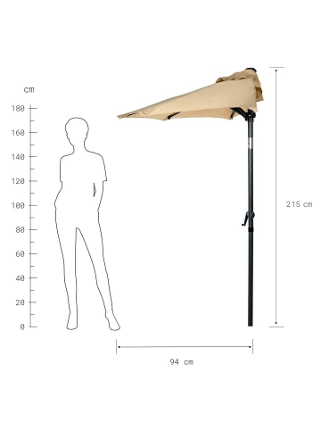 Sie spannen den halbrunden Siesta Sonnenschirm mit Polyesterbezug (UV-Standard 801) auf, sobald die Sonne hoch am Himmel steht. Einfach bei Bedarf kippen – und schon gönnen Sie sich eine kleine, erholsame Siesta im Schatten. – Spannen Sie den Siesta Sonnenschirm auf – Lieferumfang: 1x Siesta Sonnenschirm – Für den Außengebrauch geeignet. – Gestell aus Aluminium, Bezug aus Polyester – Breite 184 x Tiefe 94 x Höhe 215 cm, Höhe der Kippfunktion: 163 cm, Schirmstange: Ø 38 mm, Höhe der Kurbel 115 cm, Tiefe der Kurbel 12 cm