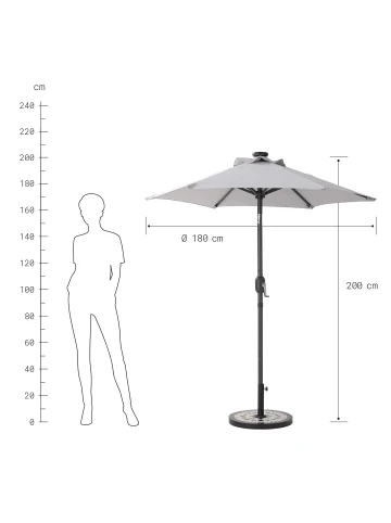 Spendet tagsüber Schatten und UV-Schutz – und in der Dunkelheit Licht: Der Sun & Stars Sonnenschirm mit 1,8 m Durchmesser verfügt über solarbetriebene LED Lichter an der Unterseite der Aluminium-Streben. Die benötigte Energie tankt der integrierte Akku bei Sonneneinstrahlung, während Sie sich ein entspanntes Päuschen auf dem Balkon oder der Terrasse gönnen. Mit Knickfunktion von ca. 45 Grad in 2 Richtungen ist es dabei ein Leichtes, den Schirm perfekt auszurichten. In einer weiteren Größe erhältlich. Passende Schirmständer sind separat erhältlich. – Aluminium-Gestell: leicht und stabil – Lichtbeständiger Polyesterbezug mit UV-Schutz: wirkt wie LSF 80 – Hochwertige, wetterfeste Ausführung – Praktisch: mit Kurbel und Kippfunktion