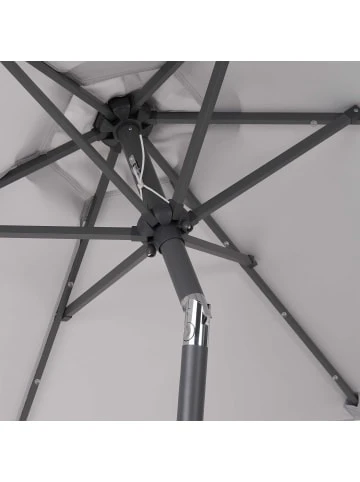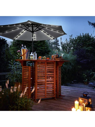 Spendet tagsüber Schatten und UV-Schutz – und in der Dunkelheit Licht: Der Sun & Stars Sonnenschirm mit 2,7 m Durchmesser verfügt über solarbetriebene LED Lichter an der Unterseite der Aluminium-Streben. Die benötigte Energie tankt der integrierte Akku bei Sonneneinstrahlung, während Sie sich ein entspanntes Päuschen auf dem Balkon oder der Terrasse gönnen. Mit Knickfunktion von ca. 45 Grad in 2 Richtungen ist es dabei ein Leichtes, den Schirm perfekt auszurichten. In einer weiteren Größe erhältlich. Passende Schirmständer separat erhältlich. – Aluminium-Gestell: leicht und stabil – Lichtbeständiger Polyesterbezug mit UV-Schutz: wirkt wie LSF 80 – Hochwertige, wetterfeste Ausführung – Praktisch: mit Kurbel und Kippfunktion