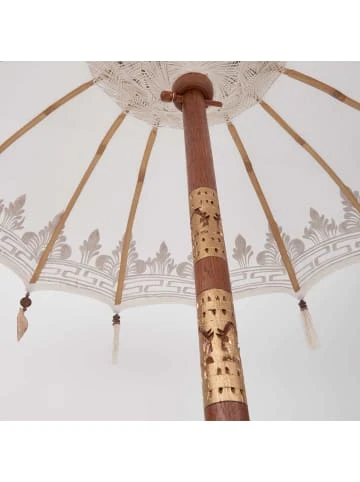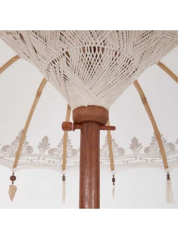 Ein Märchen aus 1000 und 1 Nacht wird wahr bei der kleinen Version des exotischen Oriental Lounge-Sonnenschirm in creme. Das prachtvolle Schmuckstück ist am Bezug mit Goldapplikationen und Ornamenten versehen, dazu mit Quasten und Dekoherzen aus Aluminium bestückt. Die Schirmspitze wurde aufwändig gestaltet, ebenso der Stab. Innen schaut man auf zu einer Jute-Verkleidung in Makramee-Handarbeit. Bei dieser außergewöhnlichen und wertvollen Aufmachung ist der Schirm natürlich nicht geeignet, um dauerhaft oder bei schlechtem Wetter draußen zu bleiben. In weiteren Varianten erhältlich. Der The Rock-Schirmständer ist separat bei Butlers erhältlich. – Aufwendige Verarbeitung: Handgearbeitet mit Goldapplikationen – Beachlook: für Urlaubsgefühl im Garten – Must-Have: unverzichtbar auf Balkon oder Terrasse