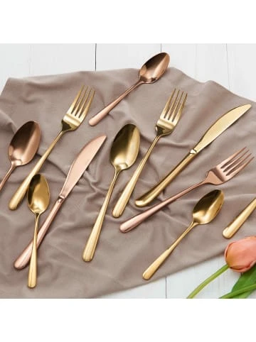 Jetzt wird’s luxuriös, denn das 4-teilige Queens Besteckset bringt majestätischen Charme auf Ihren Tisch. Ob romantisch, verspielt oder luxuriös – das hochwertige Besteckset aus Edelstahl beinhaltet alles was Sie für eine geschmackvoll eingedeckte Tafel brauchen und rundet jeden Stil königlich ab. Sowohl im Alltag als auch zu ganz besonderen Anlässen überzeugt das glänzende Essbesteck durch das schlichte Design und die eleganten Formen. – besonderes robust durch PVD-Beschichtung – hochwertiges Besteck aus rostfreiem Edelstahl – glänzendes Besteck in aktuellen Trendfarben – unterstreicht einen romantisch-verspielten Stil – Ideal für besondere Anlässe oder den täglichen Gebrauch geeignet – Lebensmittelecht und Formstabil