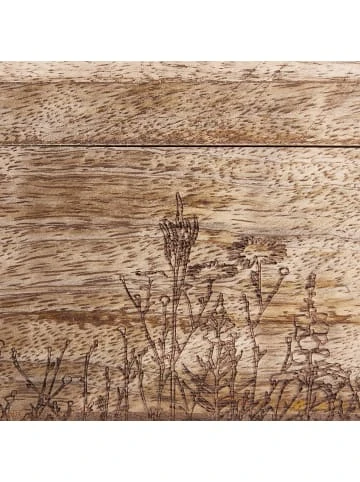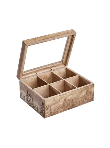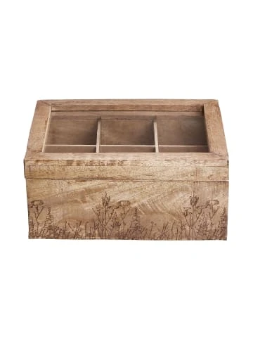 Alle Ihre Teesorten griffbereit: In der Tea Time Teebox mit Blumen-Lasergravur aus braunem Mangoholz verstauen Sie jede Menge Teebeutel übersichtlich und kompakt. Die dekorative Box braucht sich dabei nicht im Schrank zu verstecken und kann beispielsweise auf dem Frühstückstisch oder der Anrichte stehen bleiben – von Teatime zu Teatime.