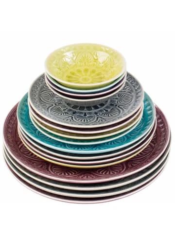 Der prächtige, asiatische Sumatra Teller mit einem Durchmesser von 25 cm und traditionellem Dekor ist ein handbemaltes Unikat mit effektvoll glänzender Glasur. Der große Speiseteller aus Steinzeug ist ein echter Blickfang auf Ihrem gedeckten Tisch. Die kostbare Optik des bunten Tellers bietet einen feinen Kontrast zu den sehr scharf gewürzten Speisen, die man traditionell auf der Insel Sumatra reicht. – Handbemalte und robuste Keramik in zarter Optik – Kontrast: Glänzende Innenglasur und matte Außenglasur – Fühlbare Reliefstruktur in leuchtenden, harmonischen Farben – Krakelee-Effekt: gesprungene Glasur nach asiatischem Vorbild – Hervorragend kombinierbar für Hochzeit, Festessen, Sommerparty