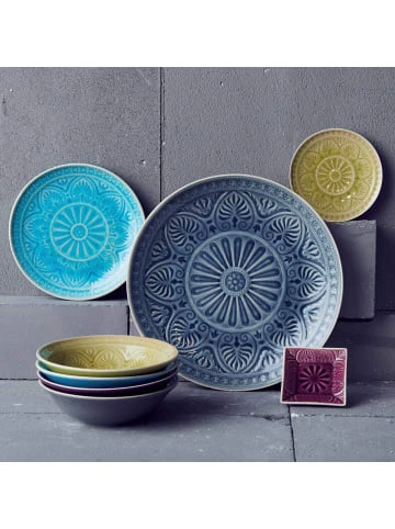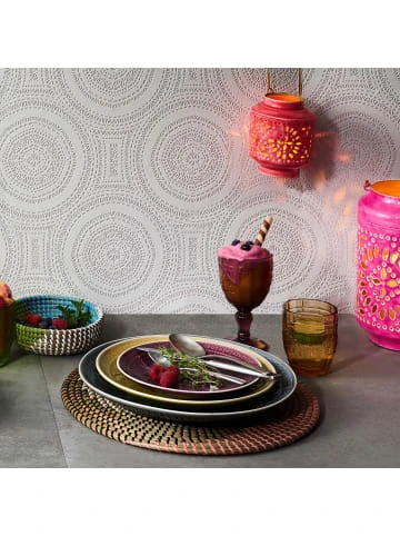 Der prächtige, asiatische Sumatra Teller mit einem Durchmesser von 31 cm und traditionellem Dekor ist ein handbemaltes Unikat mit effektvoll glänzender Glasur. Der große Speiseteller aus Steinzeug ist ein echter Blickfang auf Ihrem gedeckten Tisch. Die kostbare Optik des bunten Tellers bietet einen feinen Kontrast zu den sehr scharf gewürzten Speisen, die man traditionell auf der Insel Sumatra reicht. – Handbemalte und robuste Keramik in zarter Optik – Kontrast: Glänzende Innenglasur und matte Außenglasur – Fühlbare Reliefstruktur in leuchtenden, harmonischen Farben – Krakelee-Effekt: gesprungene Glasur nach asiatischem Vorbild – Hervorragend kombinierbar für Hochzeit, Festessen, Sommerparty