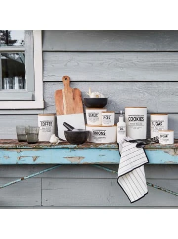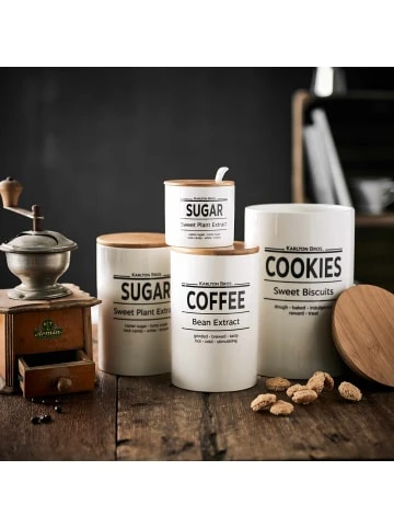 Die Karlton Bros. Vorratsdose Coffee im skandinavischen Landhausstil sieht nicht nur schön aus, sondern ermöglicht auch eine ideale Lagerung Ihres Kaffees. Der große Vorratsbehälter bietet mit einer Füllmenge von 1,1 Litern ausreichend Platz für Kaffeepulver oder Bohnen. Zudem ist die Kaffeedose mit Bambusdeckel und Silikondichtung bestens geeignet um Ihren Kaffee vor Feuchtigkeit zu schützen, sodass er möglichst lange sein Aroma beibehält und die Qualität erhält. Zudem schützt der Porzellan Topf durch den Deckel die umliegenden Lebensmittel vor Aroma-Übertragung, damit Sie den Kaffeebehälter bedenkenlos neben anderen Lebensmitteln lagern können. Um das Bild perfekt zu machen, gibt es noch weitere Vorratsbehälter im skandinavischen Design aus der Karlton Bros. Serie für Ihre Küche.